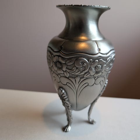 Vase i stål med dekorative rosetter. Høyde 22 cm og bredde 16 cm. Tung