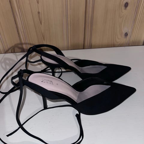 Zara Hæler i størrelse 37. Skoene er hvite med stiletthæl og spiss tupp. Materialet ser ut til å være lakkert skinn eller imitert skinn. Designet er for dame.
