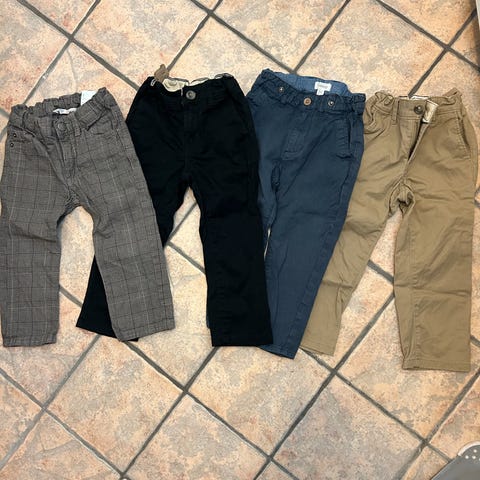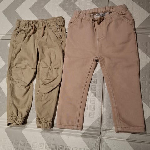 Den blå buksa er størrelse 98. De er brukt i samme tidsrom