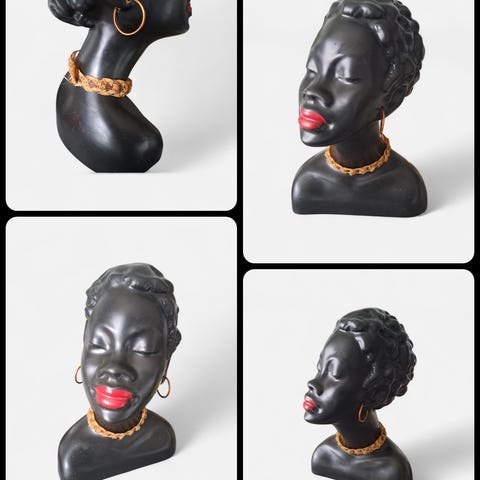 Ukjent merke Afroamerikansk kvinnefigur skulptur i svart keramikk. Figuren er av en sittende kvinne med detaljer som øredobber og halskjede. Skulpturen har en høyde som passer til dekorasjon. 26 cm.