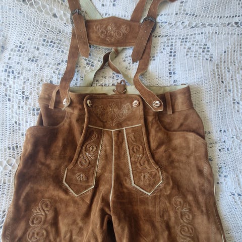 Selger ubrukt lederhosen til oktoberfest. Uten skjorte. Størrelse Large. Strikk i livet og justerbare skulderstropper. Ikke ekte skinn.