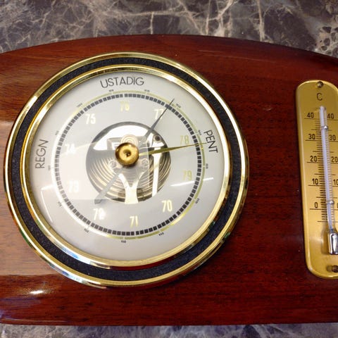 Fint lite barometer og termometer som måler ca 13x13cm. Kan kalibreres med skruen bak. Fra Sundo.
