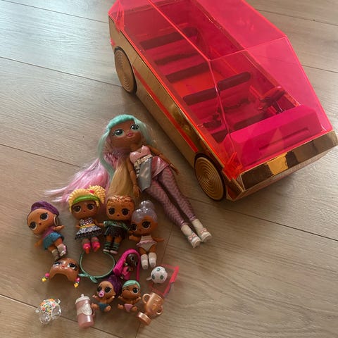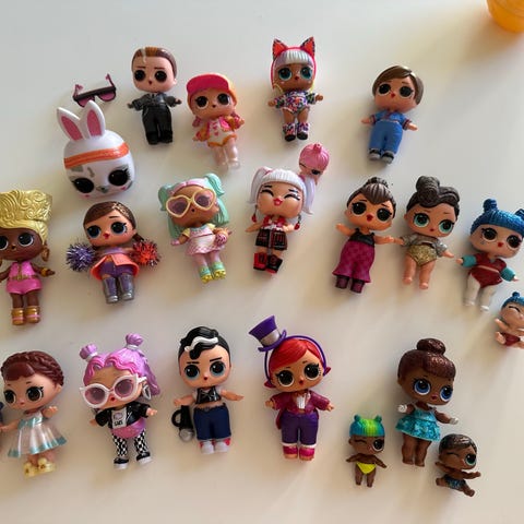 L.O.L. Surprise dukker - fem forskjellige dukker/ 4 stk og 1 baby med tilbehør som kopper og vesker. Dukker er laget for barn og har varierende farger og antrekk. Settet kan brukes til rollelek og samling.