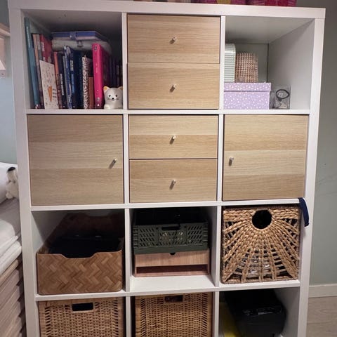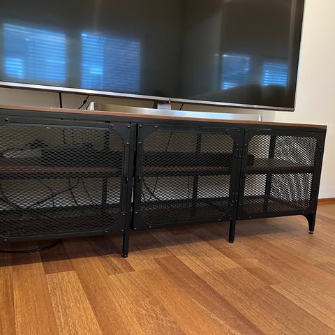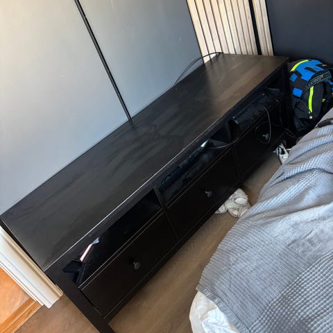 Pent brukt kallax tv benk fra ikea med skuffeseksjon og skap. Tv benken har utseende av eik. Følger også med to stråkurver til oppbevaring. Nypris 1703! Kjøpt i 2022.