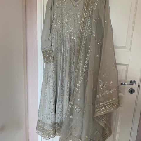 festkjole i blå farge, størrelse L. Kjolen har delikate gullfargede broderier og små dekorative detaljer over hele plagget. Materialet er lett og gjennomsiktig i ermer med dekorative broderier. Designet inkluderer en V-hals og et matchende skjerf. Egnet for formelle anledninger.