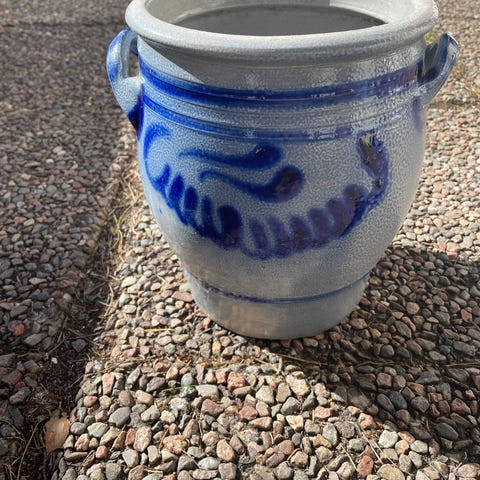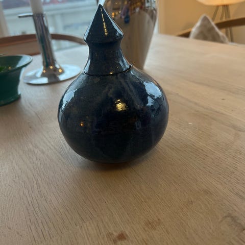 Vakker hånndreid liten keramikk krukke / bolle med blå og hvit glasur