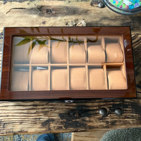 En boks av kjempe kvalitet. Veier en god del. Her har man plass til 20 klokker. Denne er perfekt for klokkesamleren. Denne er nesten ikke brukt. Noen av klokkene kan følge med om man betaler fordi. Si i fra om det er interesse.