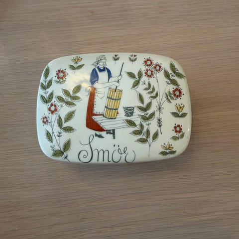 Selger en Figgjo Folklore smørskål. Den er et vintageprodukt fra den norske fajansefabrikken Figgjo, som ble etablert i 1941. Mønsteret heter Folklore.