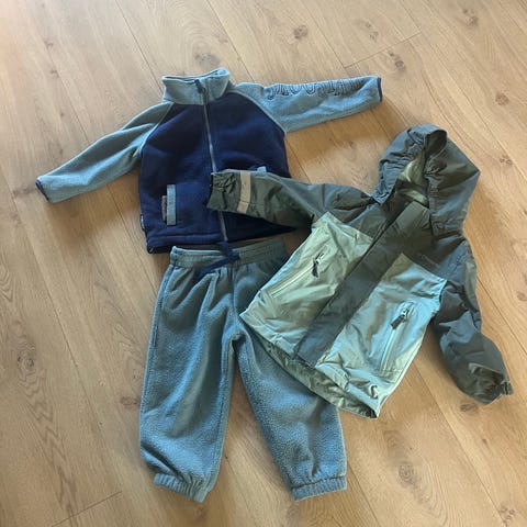Alt har vært kjøpt nytt / strikket til ett barn, og brukt ca halvannen sesong.