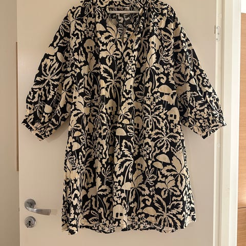 Blomstret kjole fra Fall Winter Spring Summer. Rett modell. Ingen vasketag. Splitt begge sider. Kan være polyester. Foret. Størrelse ca XL, se mål under. Meget pen. Lengde fra overkant skulder til skjørtekant ca 114 cm. Omkrets under armene ca 105 cm, liv ca 105 cm. Billigste porto. Se også mine øvrige annonser (trykk på min profil for å se annonsene).