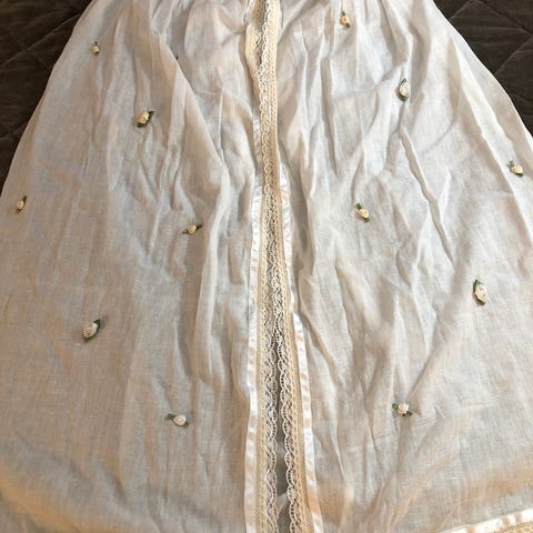 Stoff er så nydelig I grå tartan. Blonder blomstrete sydd pent på skjørtet. 🪡✨️