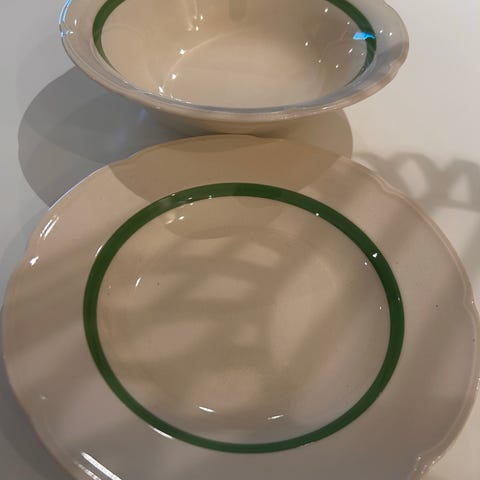 2 dype skåler, til dessert eller suppe fra Stavangerflint. Dekoren: "Grønn bånd og sort linje" . Formgiver og dekor: Thorbjørn Feyling. Håndtegnede linjer.