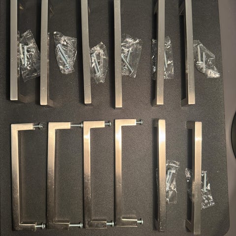 Selger 21 håndtak i rustfritt stål, med 42 skruer. Jeg er ganske sikkert at de er fra Norema.