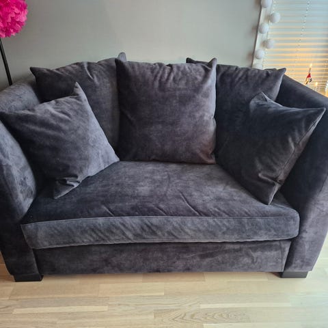 Pent brukt grå-blå sofa.