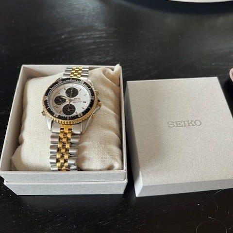Seiko 150 Sport quartz med Pepsi bezel, day-date (romertall/engelsk). Skrukrone. Ikke original lenke. Glass med synlige riper og bør byttes. Ref. 7N43-6120 / 423048. nytt batteri 19 oktober 2025