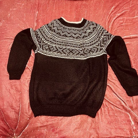 God og varm genser offhvite med mønster i rosa,lilla og blått