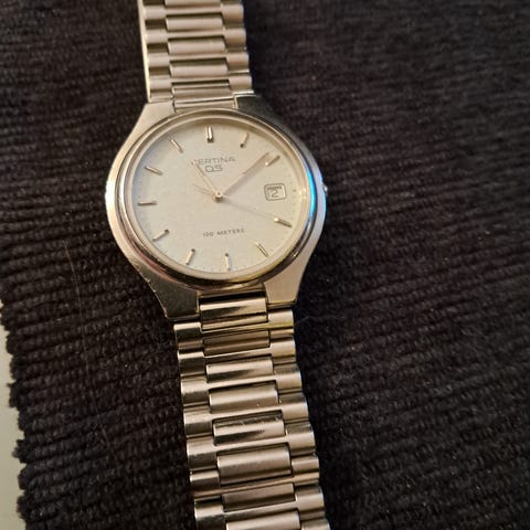 Vintage Certina DS quartz med dato og original gullfarget lenke. Signert krone, ref. 260.7195.46 / TKM-JA-14017RM. Klassisk dressklokke med et tydelig 80–90-talls preg. med nytt batteri 19 oktober 2025.