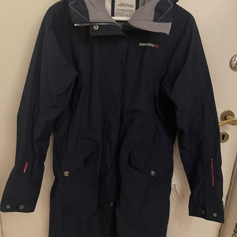 Didriksons parka regntøy for kvinner i størrelse 38, farge blå. Designet for å gi beskyttelse mot regn og fuktighet, egnet for utendørs bruk.