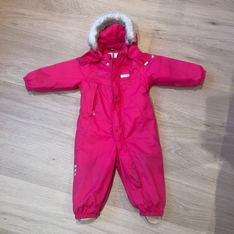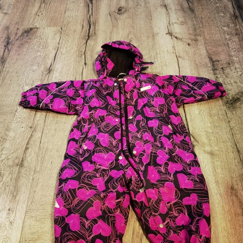 Reima Tec barnedress i størrelse 86, farge lilla. Dressen er designet for jenter og har et mønster med skogsmotiv. Laget for å gi komfort og beskyttelse ved utendørs bruk. Pent brukt. Noe slitasje på baken, men ikke som gjør noe for kvaliteten. God og varm. Kommer med hette, den er ikke vist på bilder.