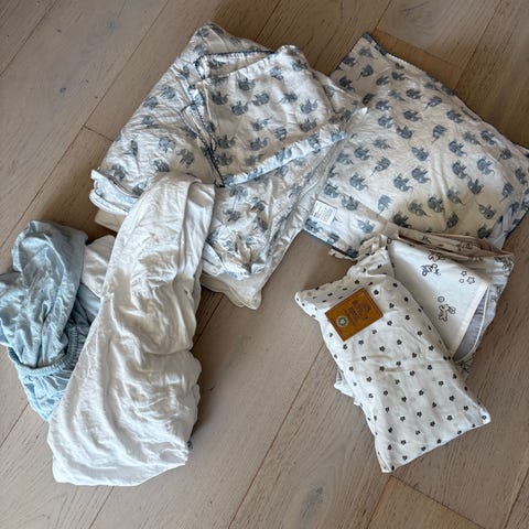 Selger en liten barnedyne (65x80) i god stand, sammen med to komplette sengesett – hvert sett inkluderer putevar og dynetrekk. Alt er pent brukt, rent og klart til bruk.