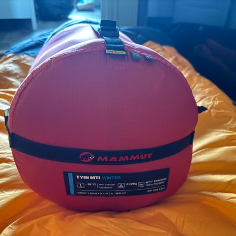 Ubrukt Mammut Tyin vintersovepose til junior. Passer opp til kroppslengde 160 cm. God og tykk pose. Har ligget lagret i tørr, temperert bod. (Nypris var ca 3000,-)