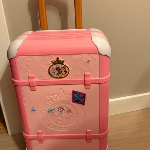 Disney lekekasse og skanner sett i rosa farge. Inkluderer en lekekasse med knappetastatur og skjerm, en håndholdt skanner med knapp, samt en leketøys-ID-kort med prinsessemotiv. Passer for barn som ønsker å leke butikk eller rollelek.