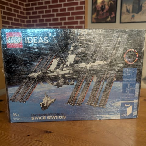 LEGO Ideas International Space Station byggesett. Inneholder deler for å bygge en modell av den internasjonale romstasjonen med detaljer som solcellepaneler og romferge. Passer for barn og voksne, anbefalt alder 16+. Produktet er laget av plast.