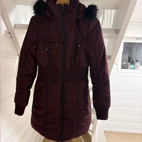 Boblekåpen er mørk brun med merket Cassani Daune. Den er godt brukt, det har vært et hull der den røde dusken henger, men ellers i fin stand. Den har knyting i livet og har en fin form.