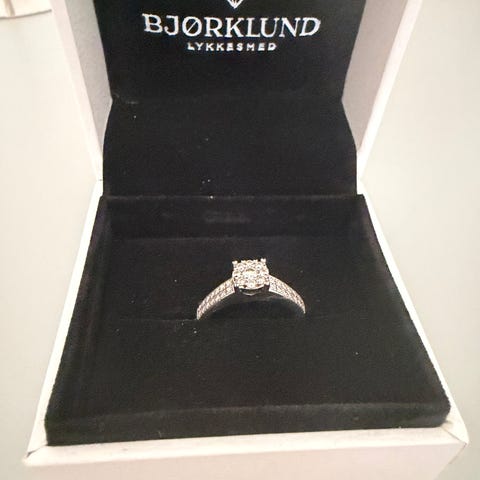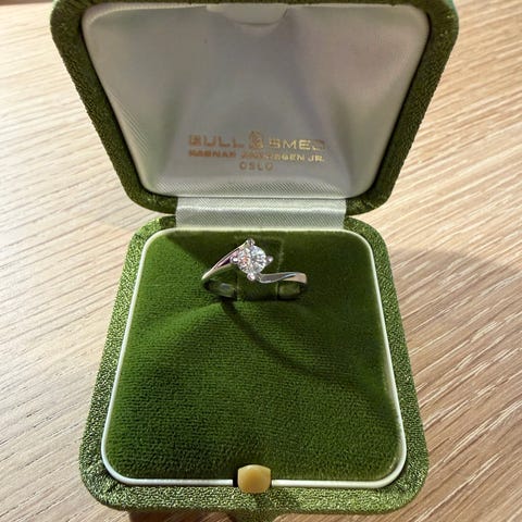 Ringen er gravert på innsiden, brukt som giftering. Ganske sikker på at den er i størrelse 58. Diamantsertifikat medfølger.