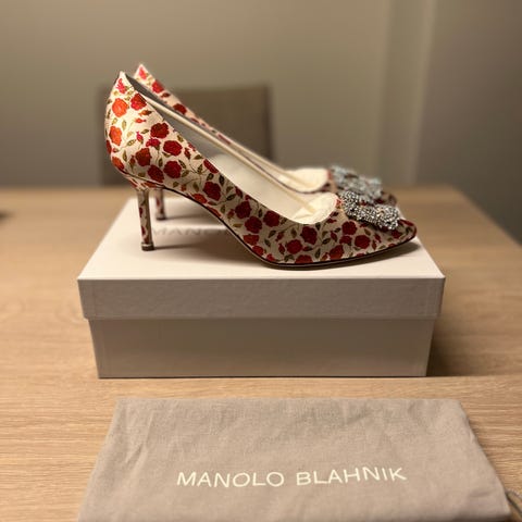Utrolig fine sko fra Manolo Blahnik selges med tungt hjerte fordi de har blitt for små etter graviditet. Har bare brukt dem 3-4 ganger. Skoene er pent brukt, med noen slitasjemerker på innsiden (se bilde). Yttersiden, som er det som vises, har ikke merker.