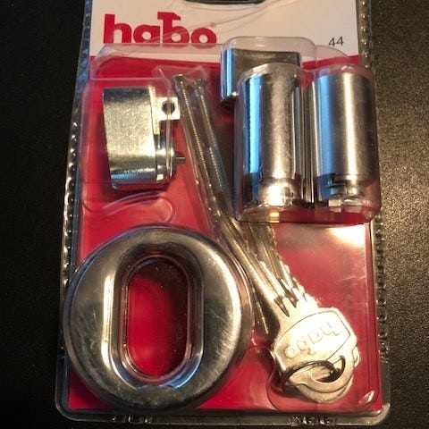 Dørlås-sett bestående av lås, sylinder med 2 nøkler, håndtak og monteringsplate i rustfritt stål. Settet inkluderer mekaniske deler for montering på dør, egnet for standard dørtykkelser. Materialet gir god holdbarhet og korrosjonsmotstand.
