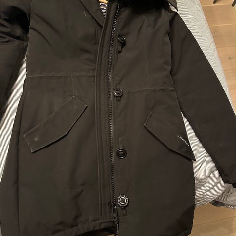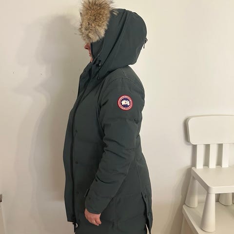 Canada Goose Victoria parkas i grå, størrelse M for kvinner. Jakken har hette med pelskant og er designet for utendørs bruk. Materialet og konstruksjonen er laget for å gi beskyttelse mot kalde værforhold.