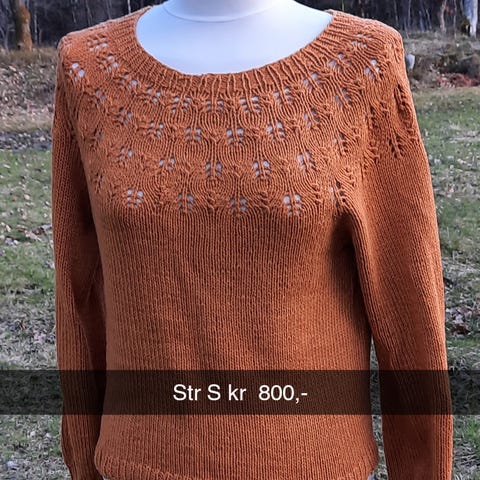 Selger hjemmestrikka genser (Snøløvgenser) i gul/ okergul. Passer str. S/M. Nesten ikke brukt.
