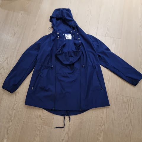 Jersey jakke med innlegg for å bruke som bærejakke. Glidelås i begge sider for å utvide for gravidmagen. Størrelse S, men vil si den er mer som en M😊