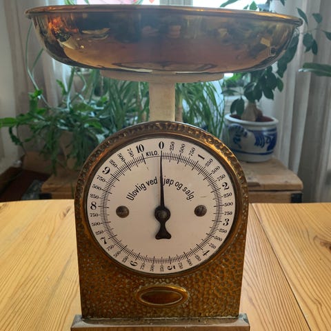 Gammel kjøkkkenvekt kjøpt på antikvariat i Fredrikstad selges. Den virker som den skal, og er dessuten et vakkert tilskudd til kjøkkenet :) Selges pga. plassmangel.