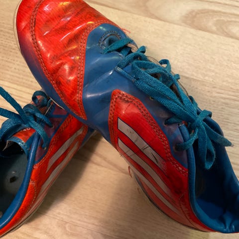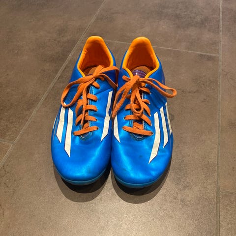Adidas fotballsko i blått med oransje snøring og innside. Skoene har knotter under sålen for bedre grep på gressbaner. Designet for bruk i fotballspill, egnet for utendørs aktivitet på gressunderlag.