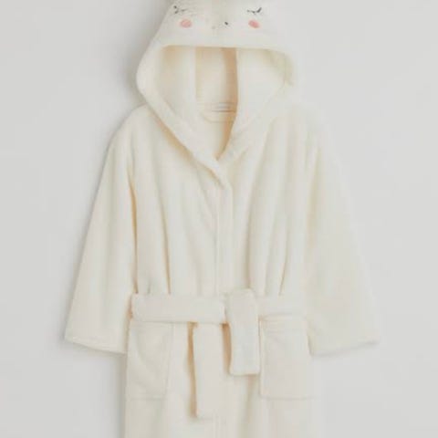 Badekåpe / morgenkåpe fra H&M Home i str. 122/128. Kåpen er offwhite og laget av mykt materiale. Den har hette med enhjørningshode, samt belte rundt midjen for justering. Passer til bruk som morgenkåpe, kosetøy, eller kostyme.