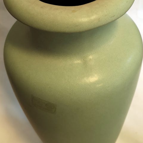 Fatet er et eksempel på "studiekeramikk" og er preget av et abstrakt, grafisk mønster i blå, grå og hvite nyanser.