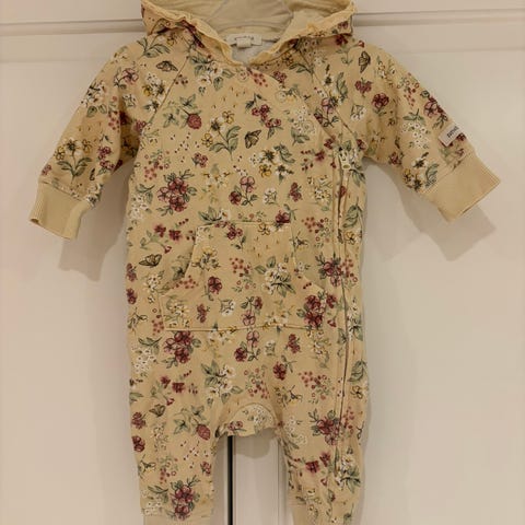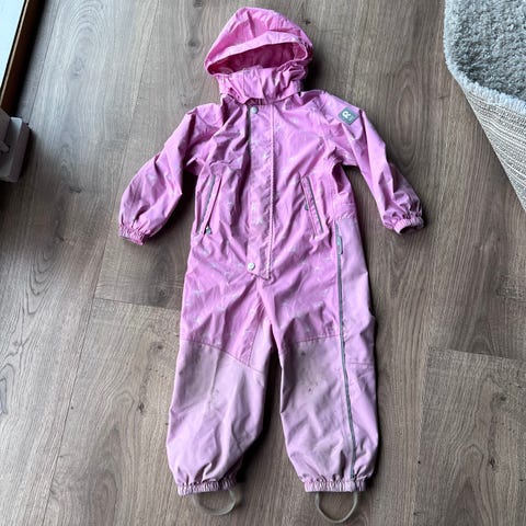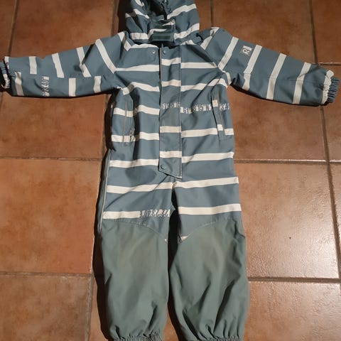 Reima Karhu barneklær kjeledress i størrelse 104, grønn farge med mønster. Kjeledressen er designet for unisex bruk og egnet for barn. Laget med funksjonelle materialer for utendørs bruk. Den er pent brukt i en halv sesong, men har kommet noen flekker som ikke har gått av i vask, spesielt på de lyse fuglene. Noe merker på armmansjettene og ved strikket i livet. Rompa er uten synlig slitasje, og beinstrikker er hele og fine. Alt i alt en pent brukt dress, uten slitasje på de sliteutsatte stedene som rompe, knær og benstrikker.