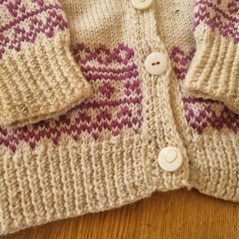 Pent brukte ullklær, litt retro, strikket for ca 10 år siden år siden av svigermor. Pent arbeid. Mulig noe kløende men funker godt utenpå andre klær, som jo er meningen.