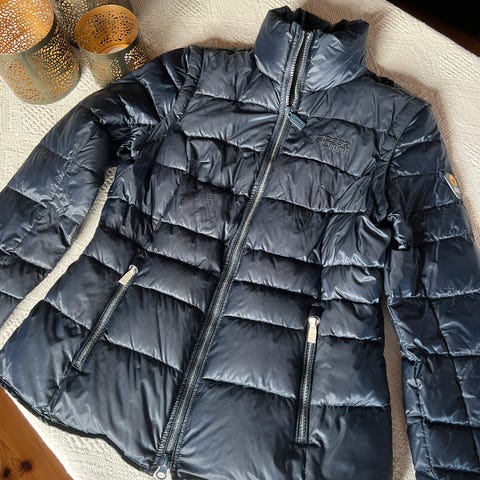 Lett og varm dunjakke. Moderne og tidløst design med innsving i midje. Mørk blå farge med fin glans. Avtagbar hette.