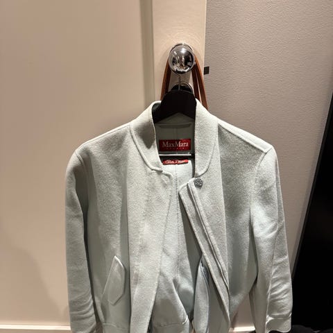 Grå Max Mara jakke/blazer i ull. Jakken har dobbelspent knappelukking og sidelommer.