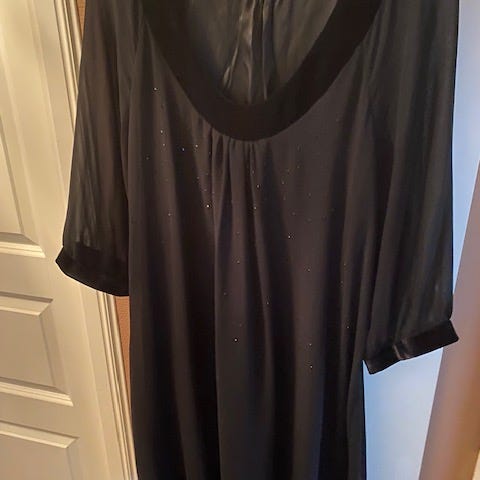Pent brukt kjole. Svart med perler i hals. Nydelig mønster i øvre del. Behagelig og god kjole. Str. 44/14.