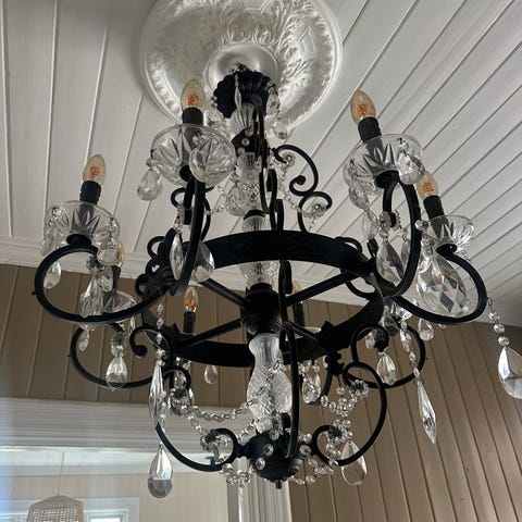 Vakker lysekrone kjøpt i antikvitetsbutikk i Fredrikstad. Lagt med bilde med lys tatt før den ble renset . 2 løse glassdeler, se bilde.