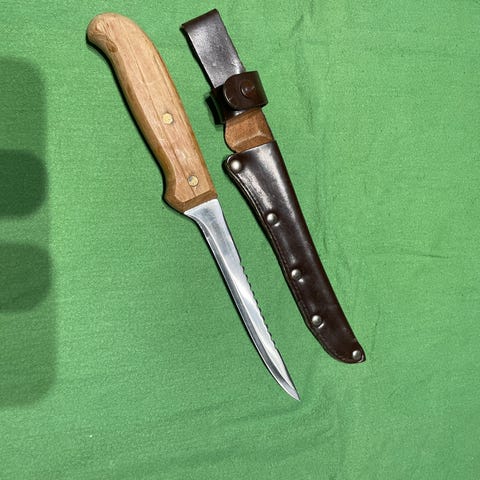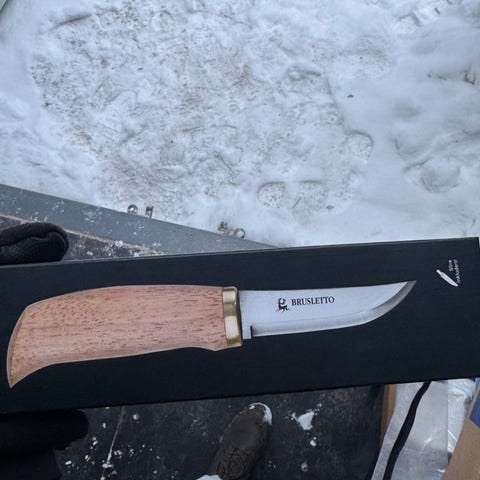 Brusletto Rypä kniv med buet blad, treskaft og svart slire. Egnet for utendørs bruk og presisjonsarbeid. Leveres i original eske.