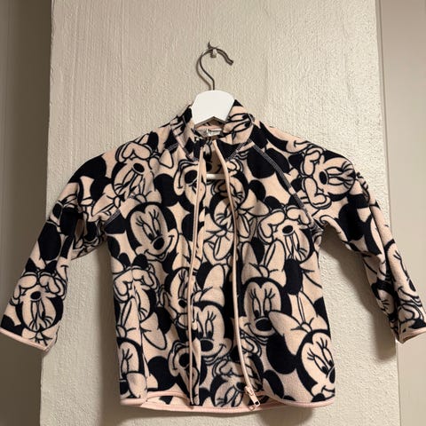 H&M barn fleecejakke og bukse i rosa med hvite prikker. Størrelse 98, designet for jente. Laget av mykt fleece-materiale som gir varme og komfort. Jakken har glidelås foran og høy hals. Buksen har elastisk midje.