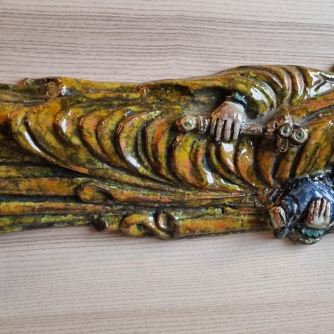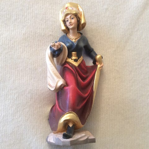 Madonna og barnet. Treskjæring..45cm. Bildet viser en trestatue av Madonnaen og barnet. Det er en kopi av Michelangelos berømte marmorskulptur, Madonnaen i Brugge. En praktfull, utsøkt utformet Madonna og barn, perfekt for veggteppe. Tradisjonell kunst. Laget av massivt tre, antagelig eik, er den relativt tung og virkelig iøynefallende. Høyde: 45 cm