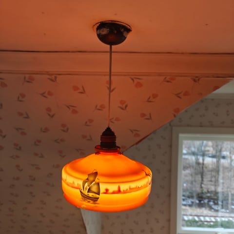 Vintage taklampe med stoffskjerm og tre- og messingdetaljer