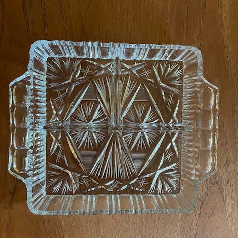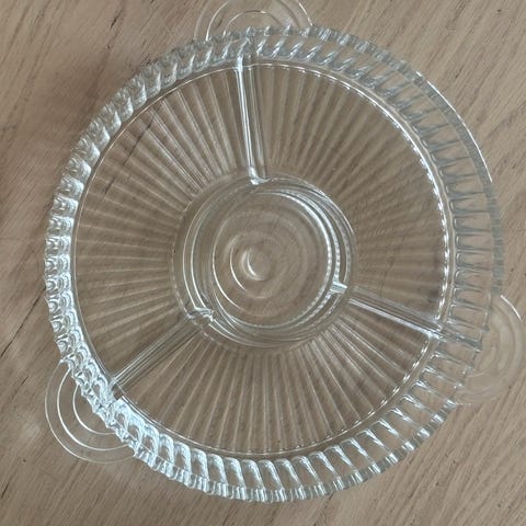 Flott kabaretfat i opalin. 25 cm I diameter. Fin tilstand, ørlite slitasje på gullet. Ikke merket, men trolig Anchor Hocking. Selges for 230 kr. Sendes mot tillegg for porto. Forhåndsbetaling med vipps. Bruker ikke Fiks ferdig.