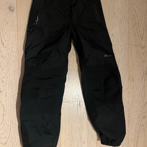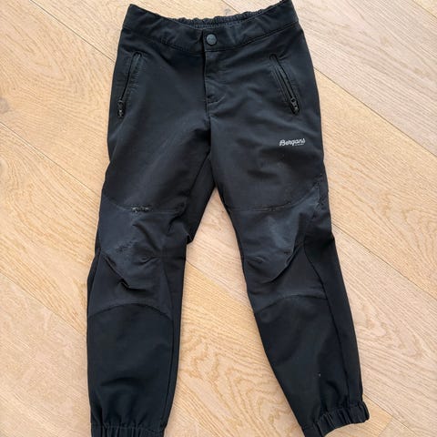 Bergans barnebukse i størrelse 140, designet for unisex-bruk. Buksen er svart og laget av slitesterkt materiale. Den har elastiske mansjetter ved anklene for bedre passform. Noe slitasje er synlig på buksen.